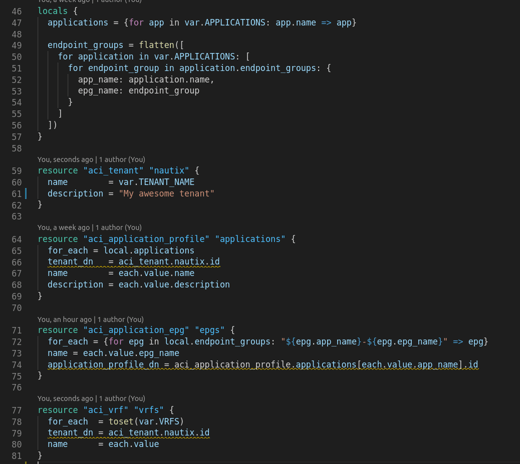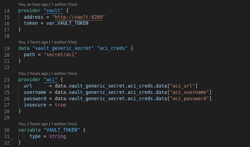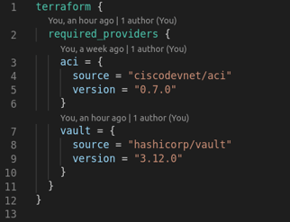 - Providers: Cisco ACI provider for resource creation and Vault provider for secure credentials.