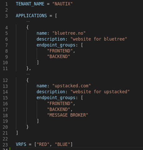 : List of VRFs to create under the tenant (["RED", "BLUE"]