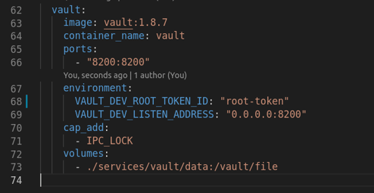 Vault service – Docker Compose file spins up Vault and other required services locally.